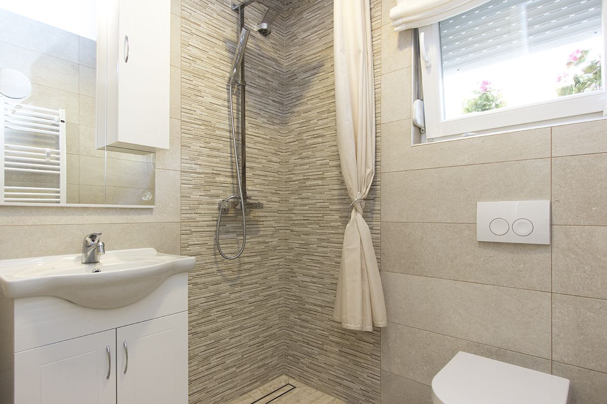 It consists of an entrance hall, a spacious living room with dining area and exit to a large balcony, kitchen with exit to a beautiful terrace, bathroom with a shower, 3 bedrooms, out of which one has access to another smaller balcony and a bathroom with a bathtub.