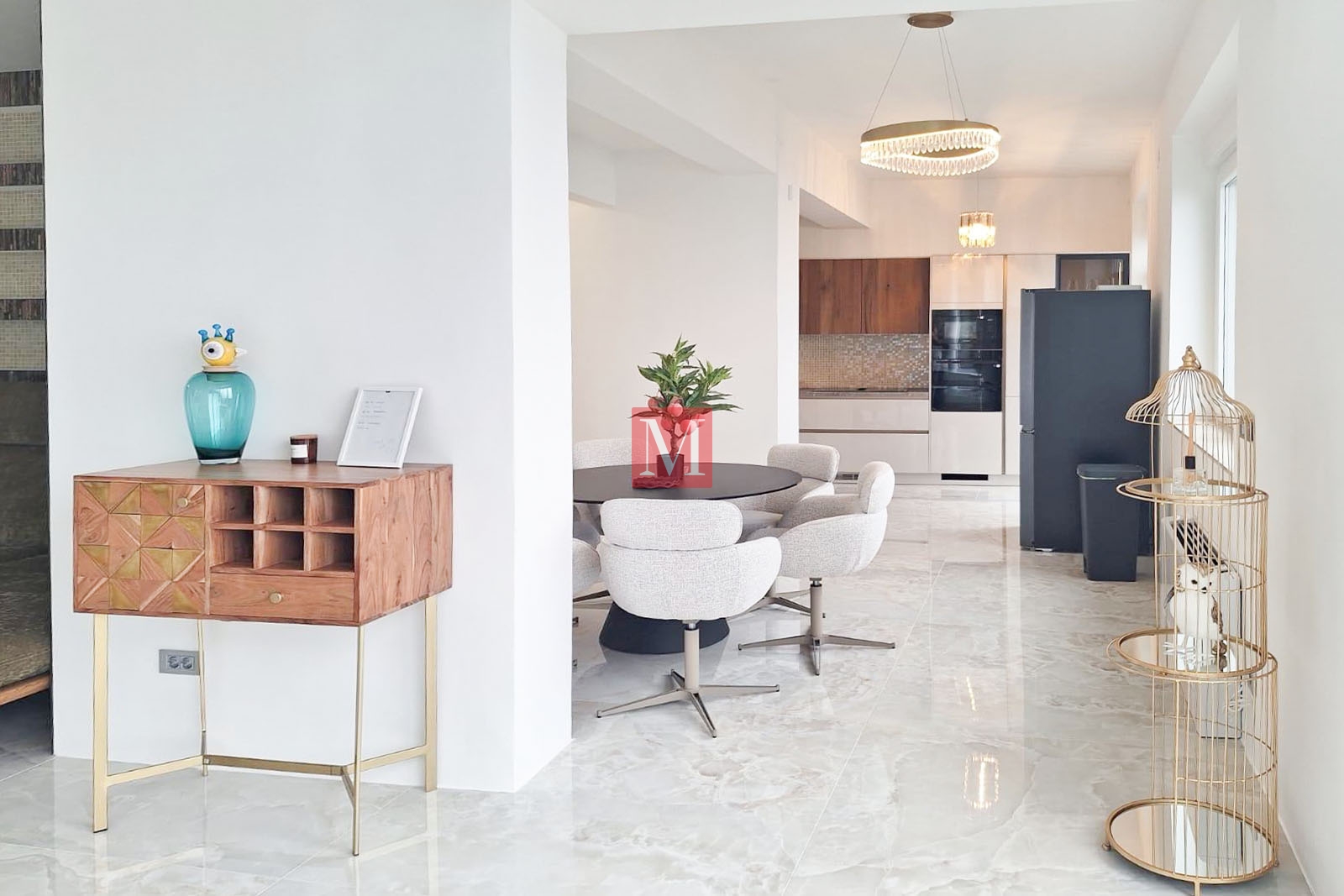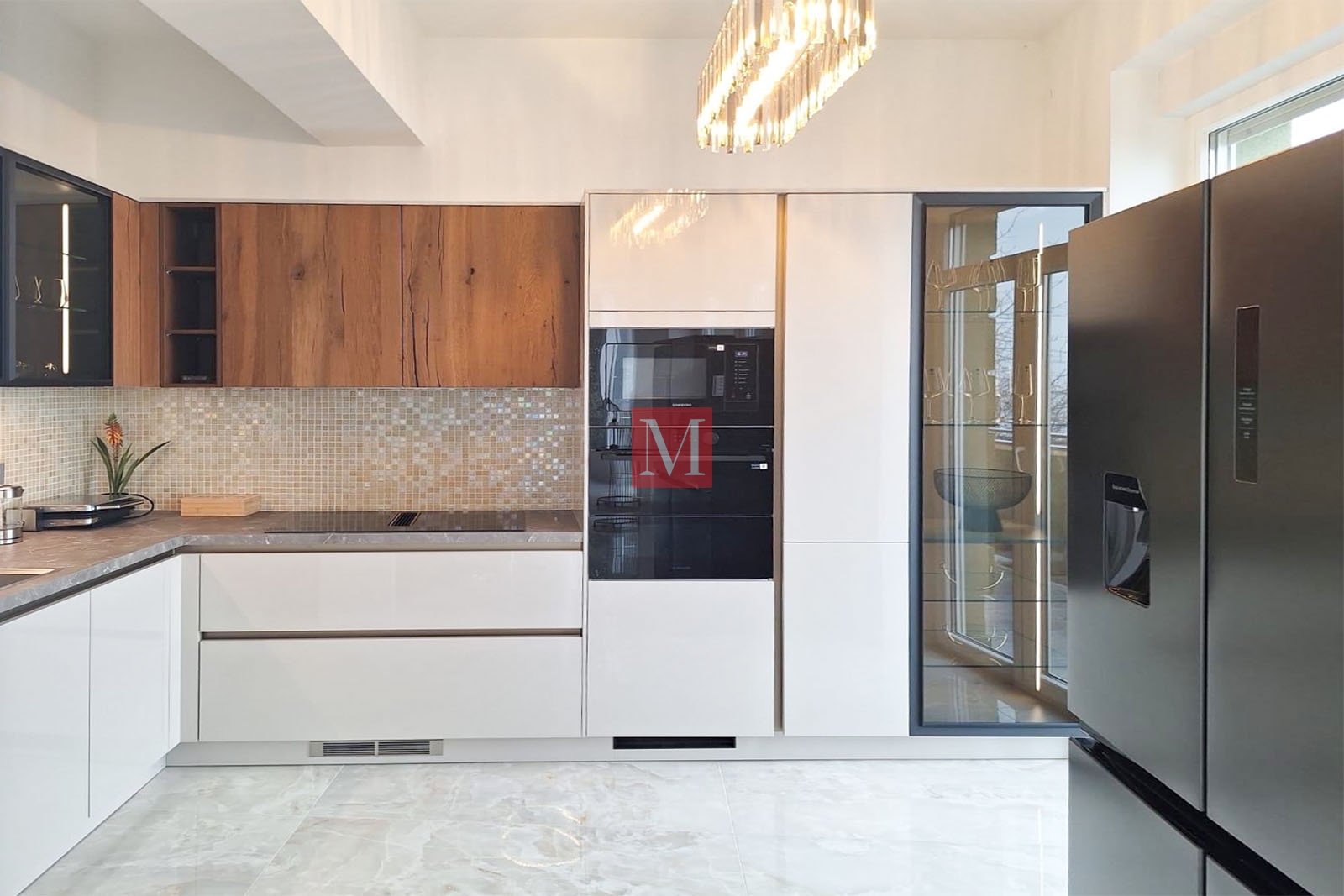 The layout includes two bedrooms with double beds, a spacious living room with a sofa that can be converted into an additional double bed, a modern bathroom with both a bathtub and a shower, and a luxury Italian kitchen equipped with top-quality Samsung appliances, including a dishwasher, pyrolytic oven, and microwave, as well as a DeLonghi coffee machine and a large double-door refrigerator. The apartment also features three TVs (163 cm) and a Samsung washing machine.