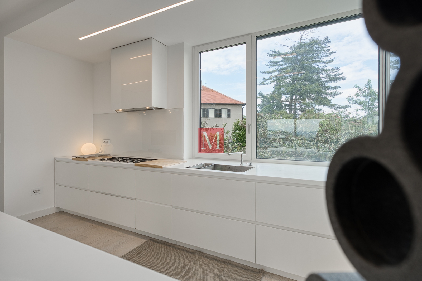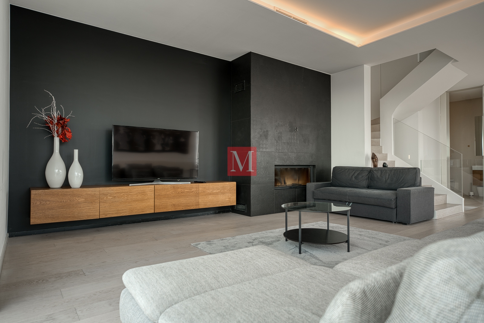 The apartment is full of light thanks to large glass walls.