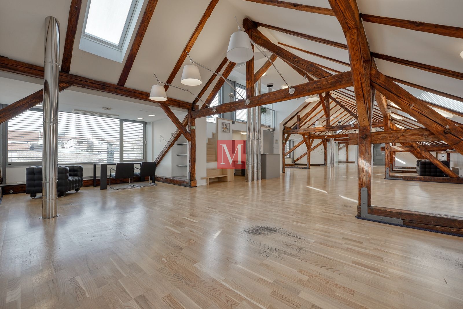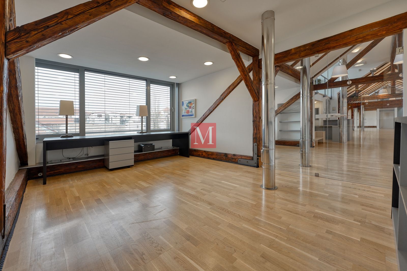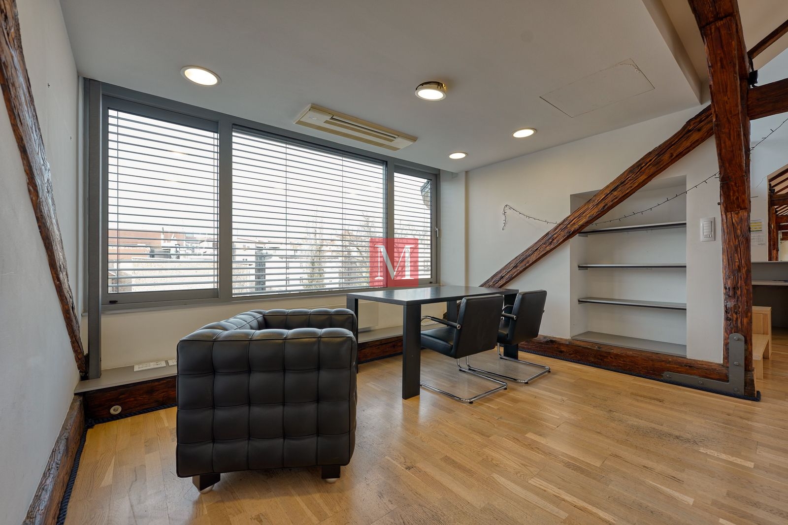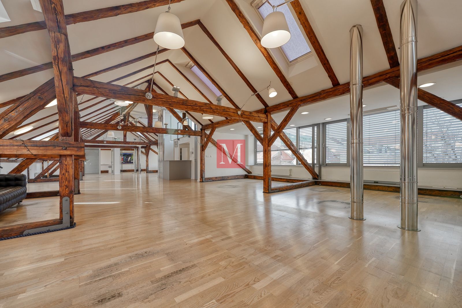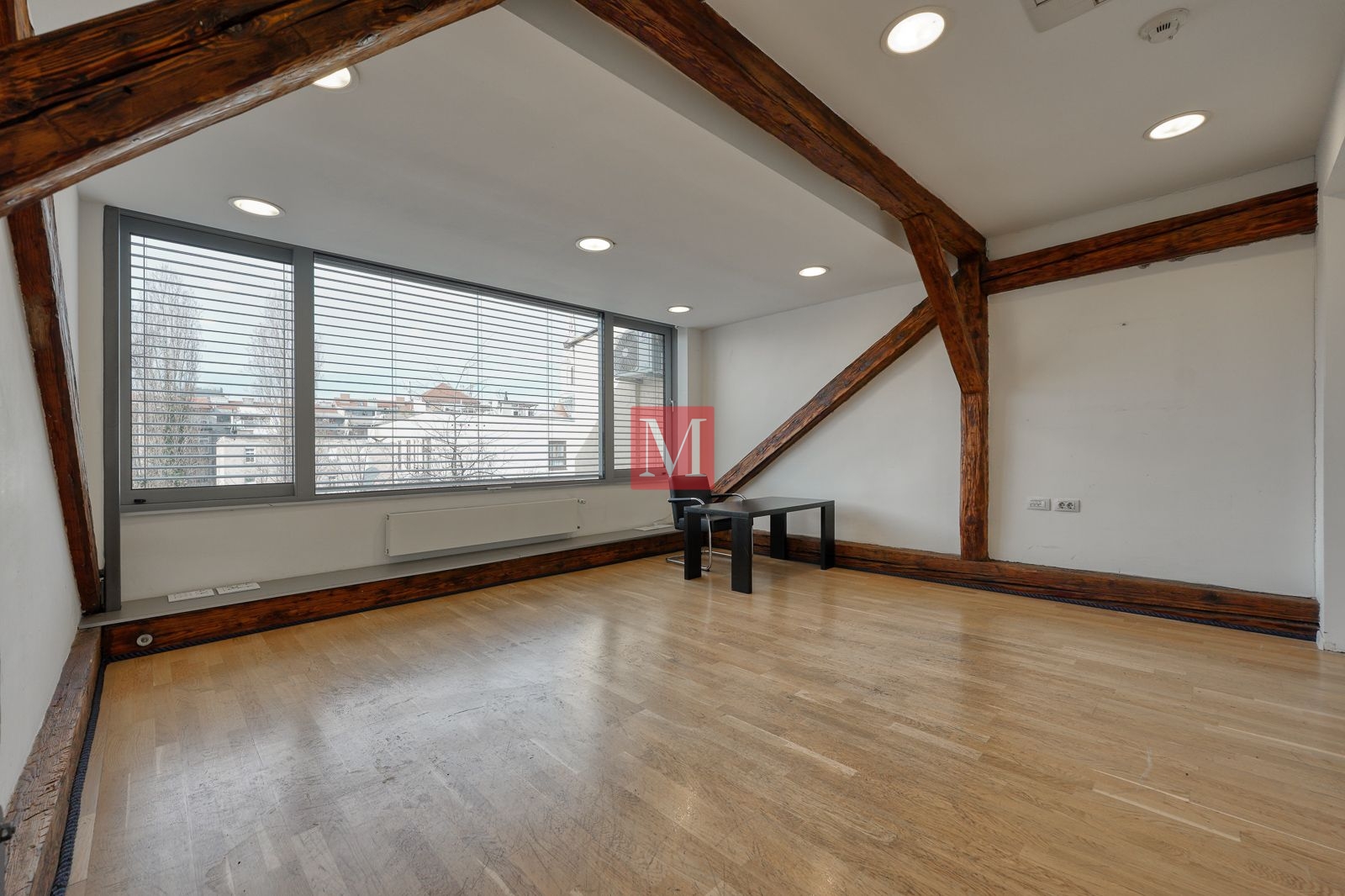 Sastoji se od 4 kancelarije, 2 sanitarna čvora (M/Ž) i spremišta, a sve ostalo je veliki otvoreni prostor od preko 130 m2 s visokim stropovima, velikim staklenim staklenima, osunčan i pun danjeg svjetla. Mirno pozicioniran, prostrana terasa s izvanrednim pogledima prema okolnim zgradama, katedrali i Sljemenu.