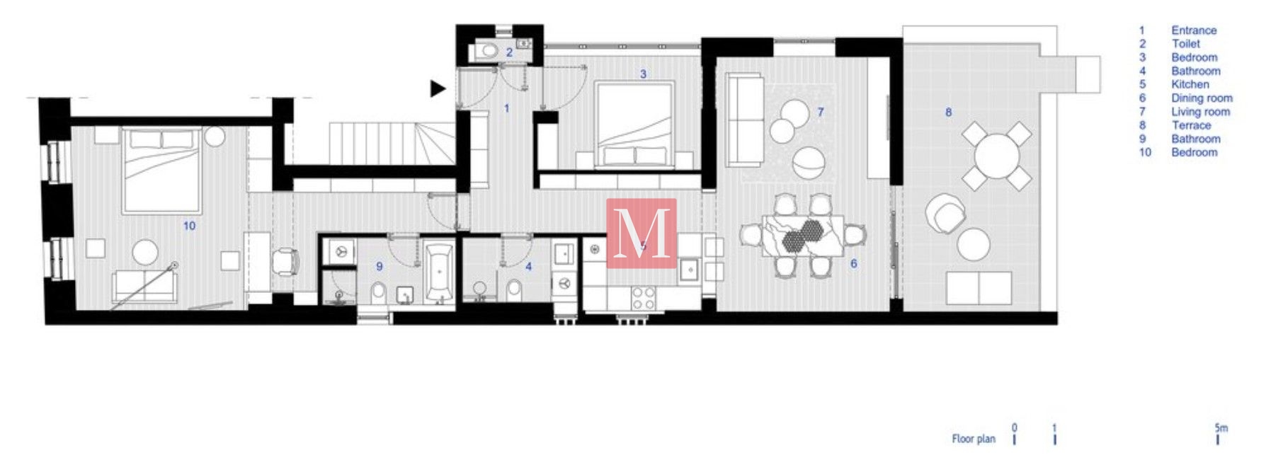 Sastoji se od ulaznog hodnika, gostinjskog toaleta, kuhinje sa blagovaonskim dijelom i dnevnim boravkom, kupaonice (tuš), spavaće sobe, glavne spavaće sobe sa kupaonicom (tuš), te velike terase koja gleda na dvorišni dio.