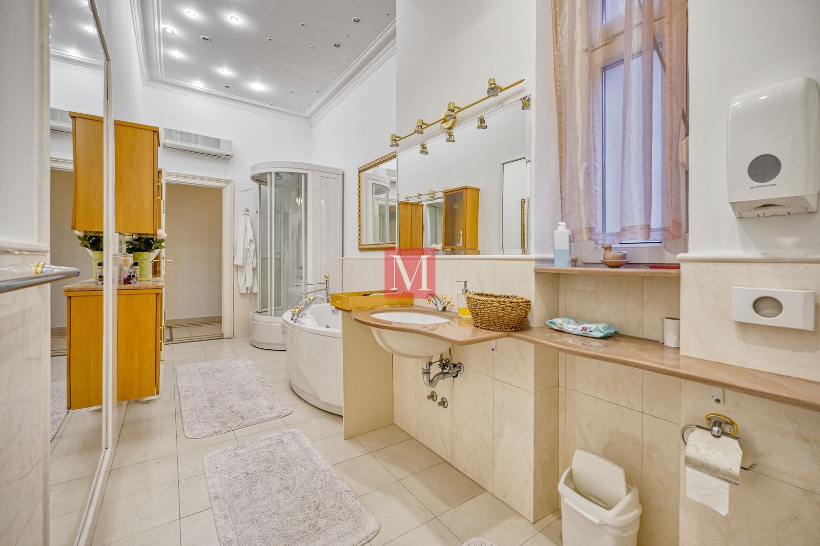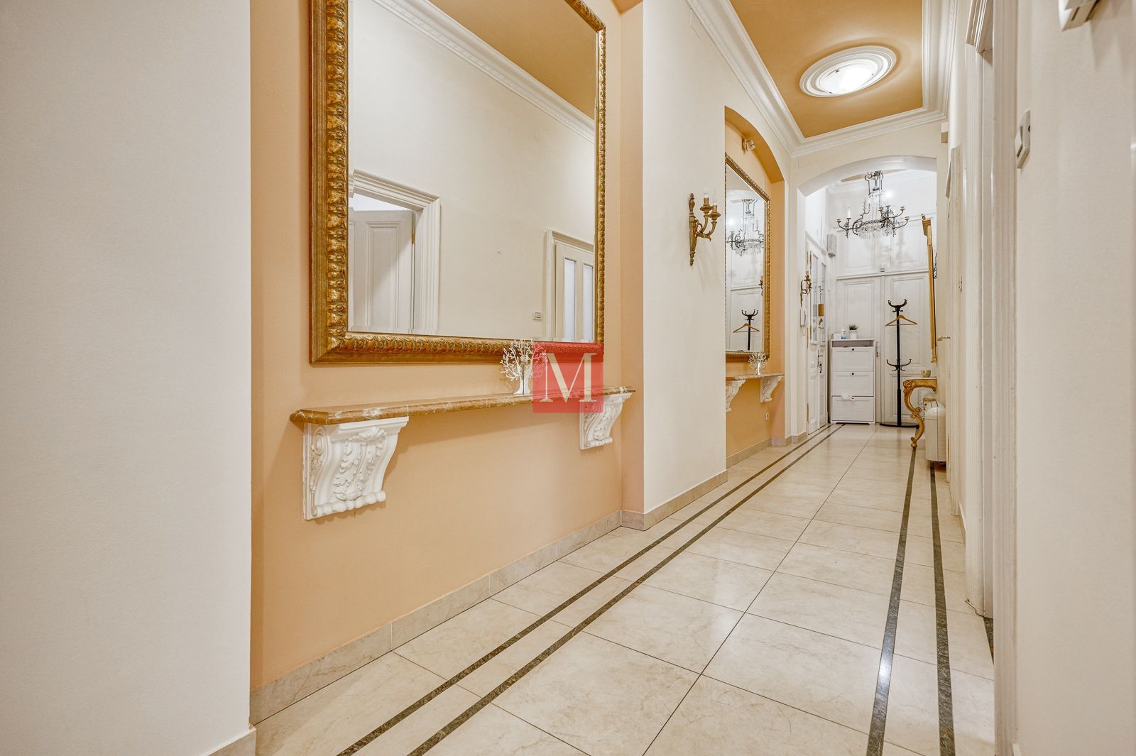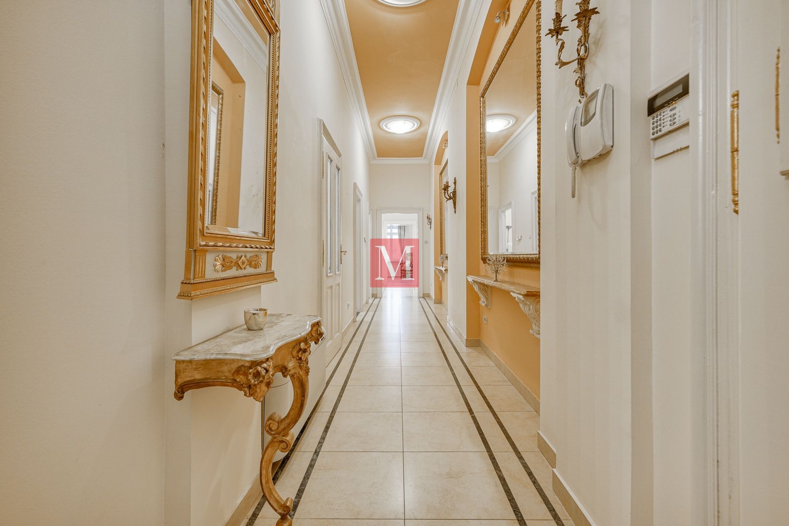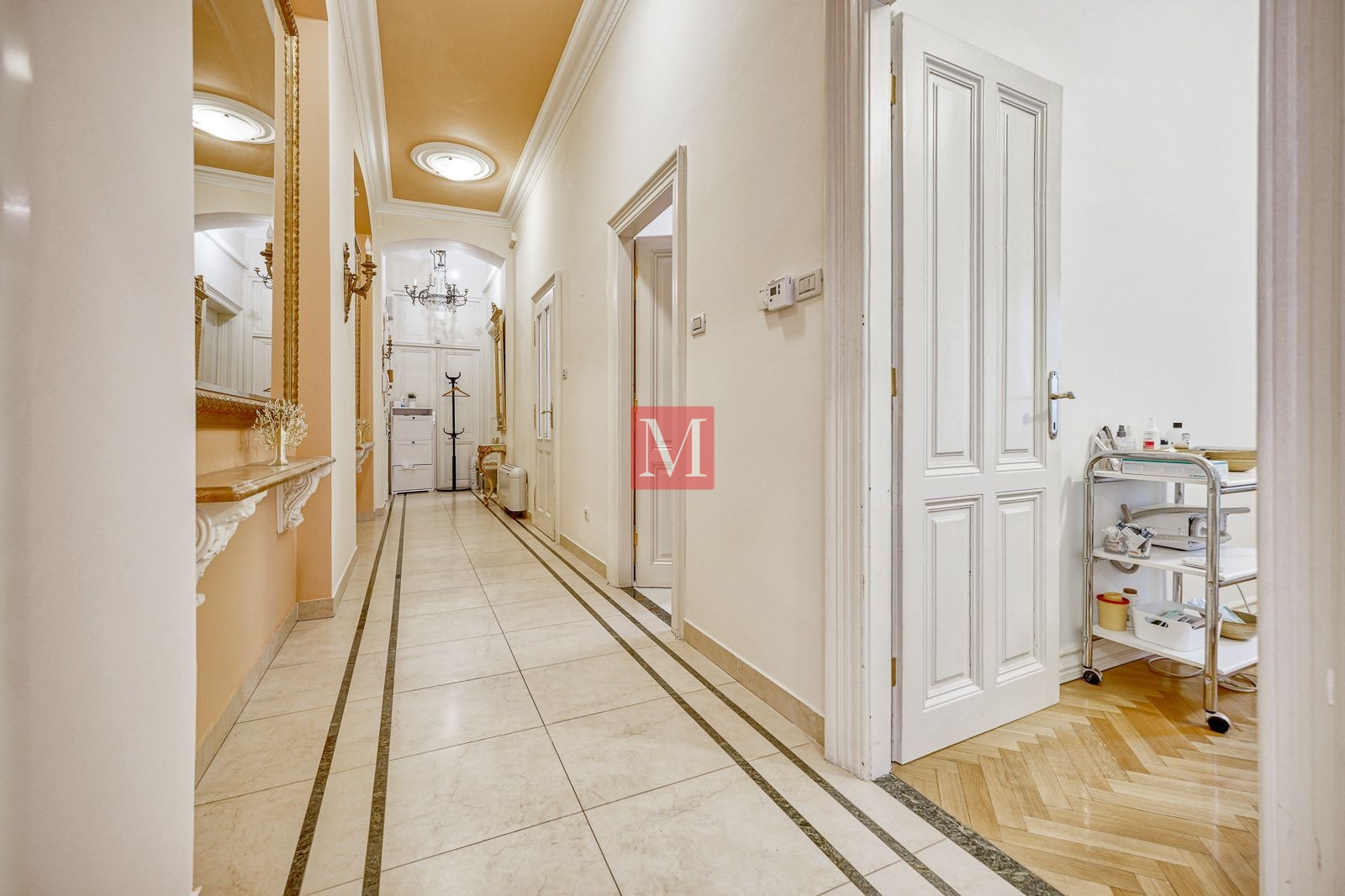 Veći stan se sastoji od reprezentativnog ulaznog hodnika, 2 salonske prostorije (sjever), 2 salonske prostorije i balkona od 4m2 (jug), manje sobe, kuhinje, 2 kupaonice (istok) i zatvorene loggie (zapad).