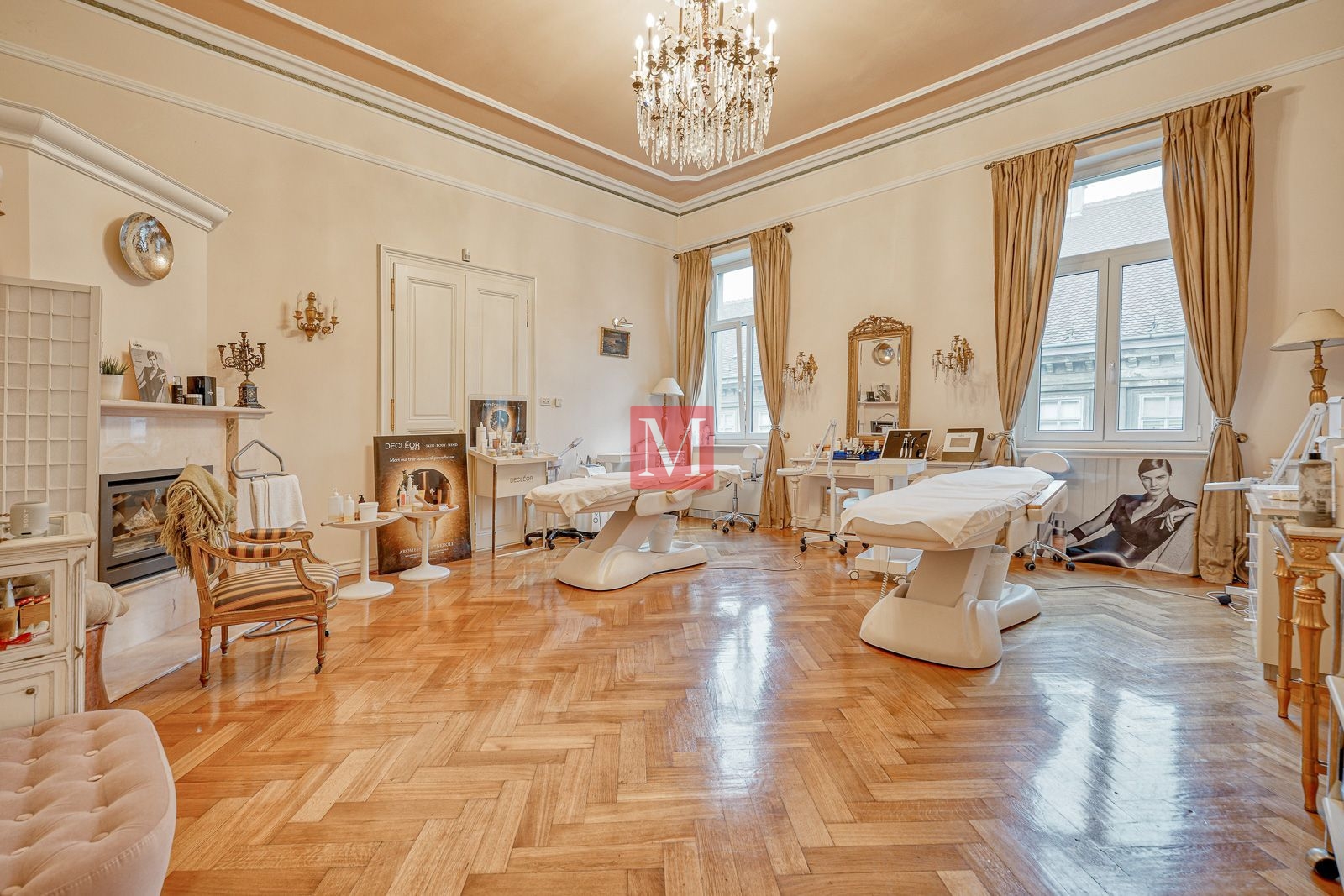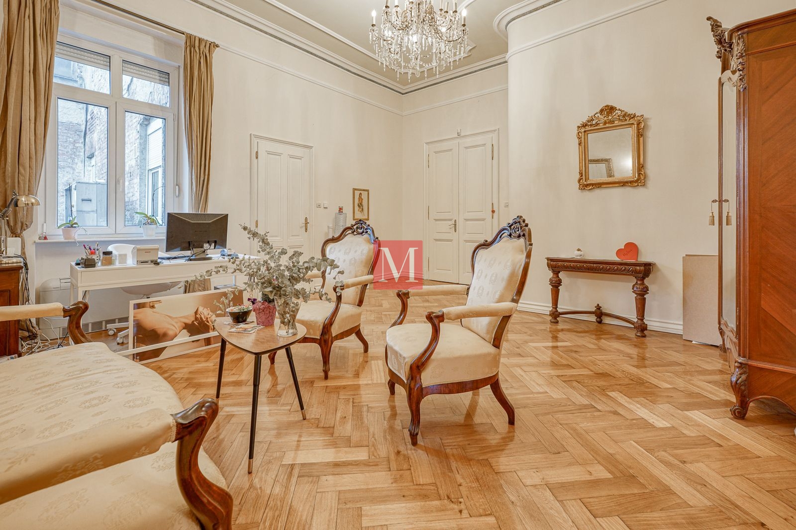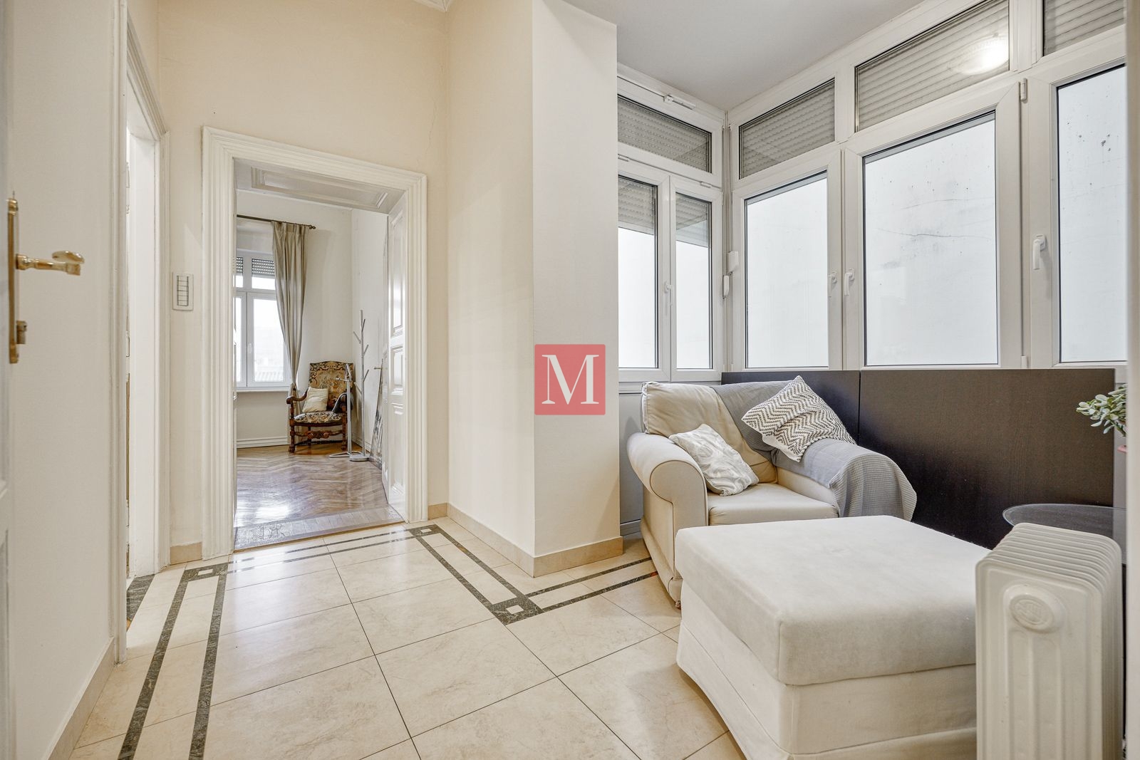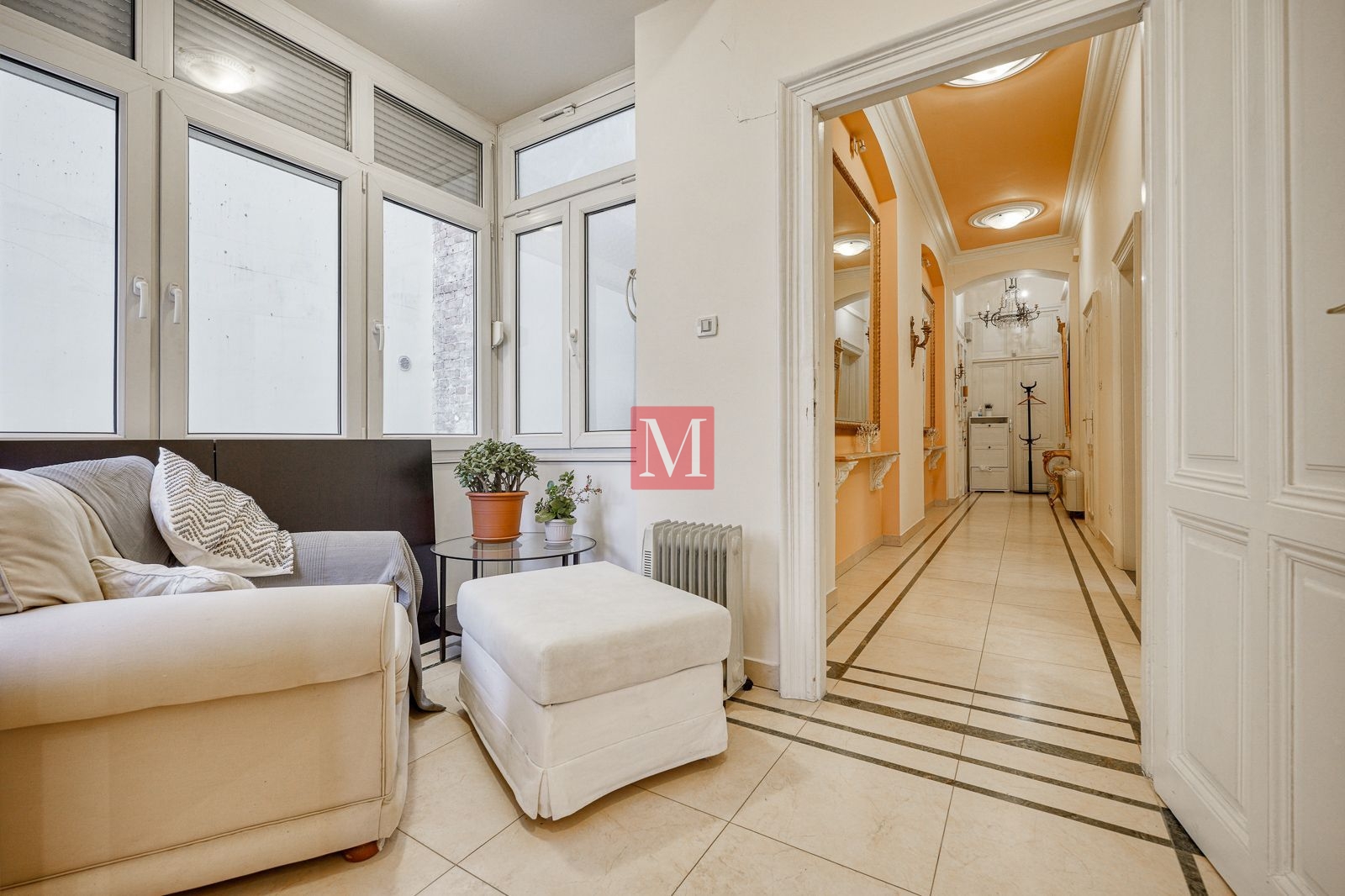 Veći stan se sastoji od reprezentativnog ulaznog hodnika, 2 salonske prostorije (sjever), 2 salonske prostorije i balkona od 4m2 (jug), manje sobe, kuhinje, 2 kupaonice (istok) i zatvorene loggie (zapad).
