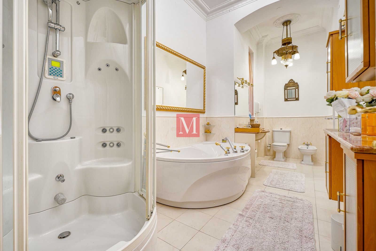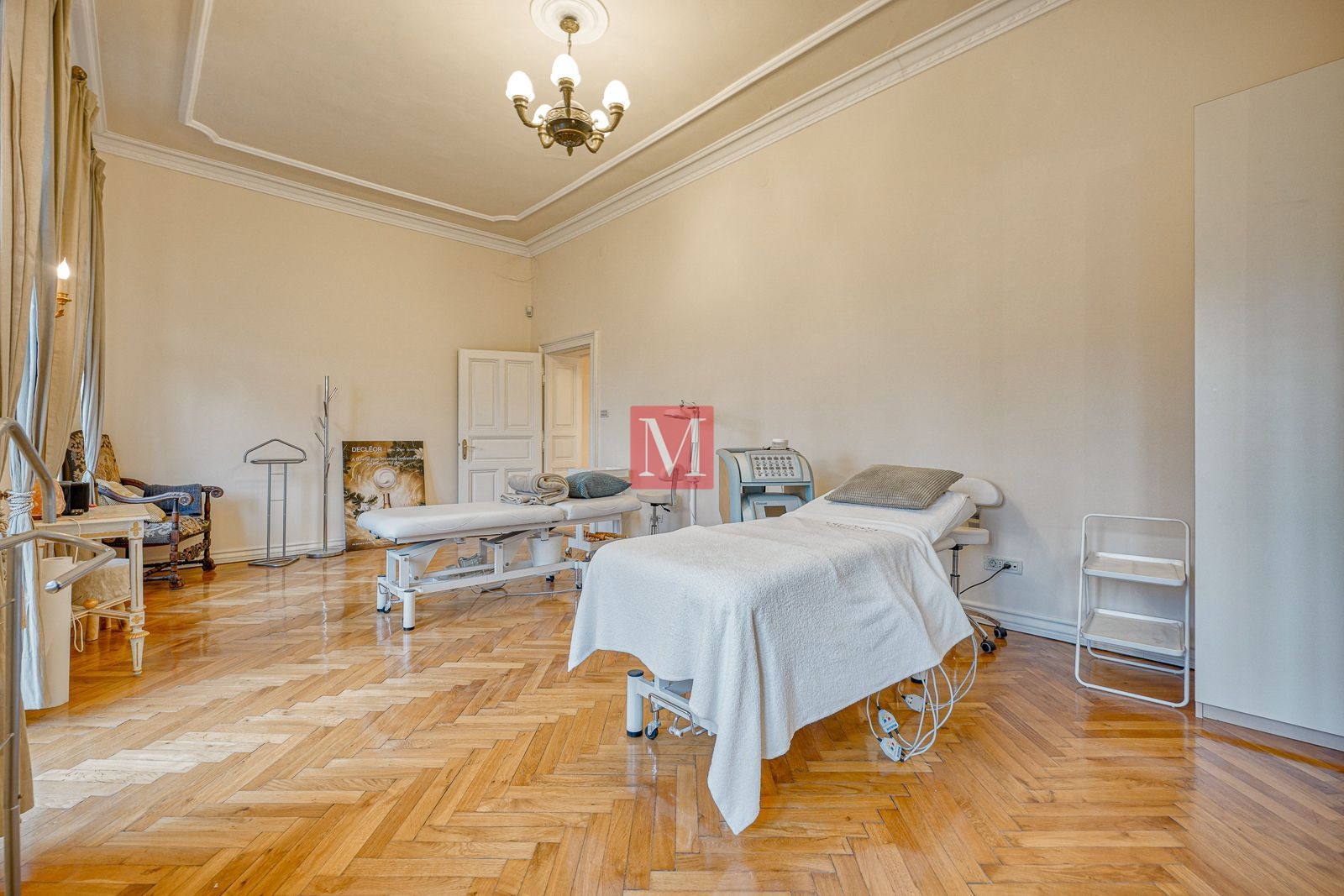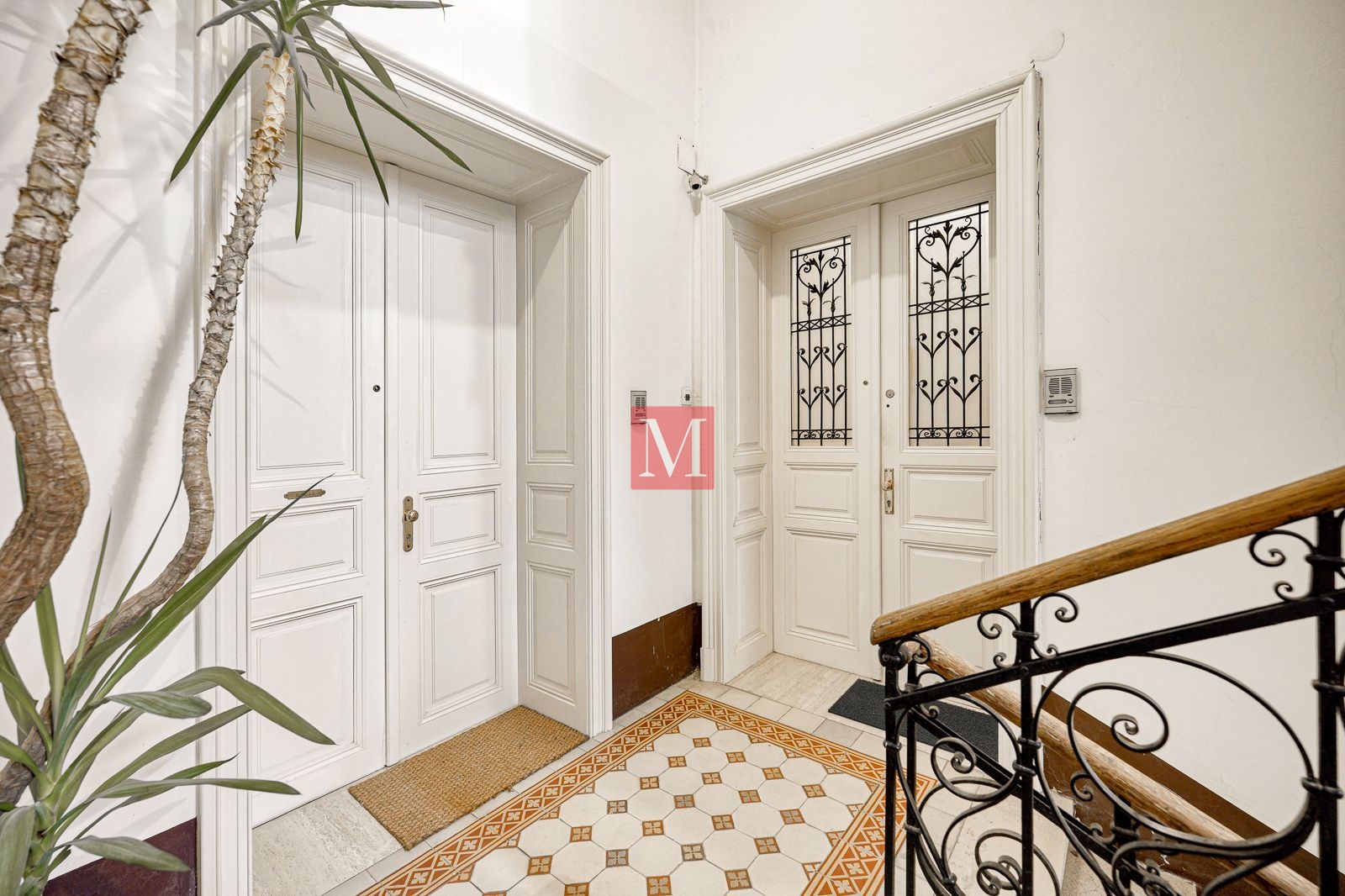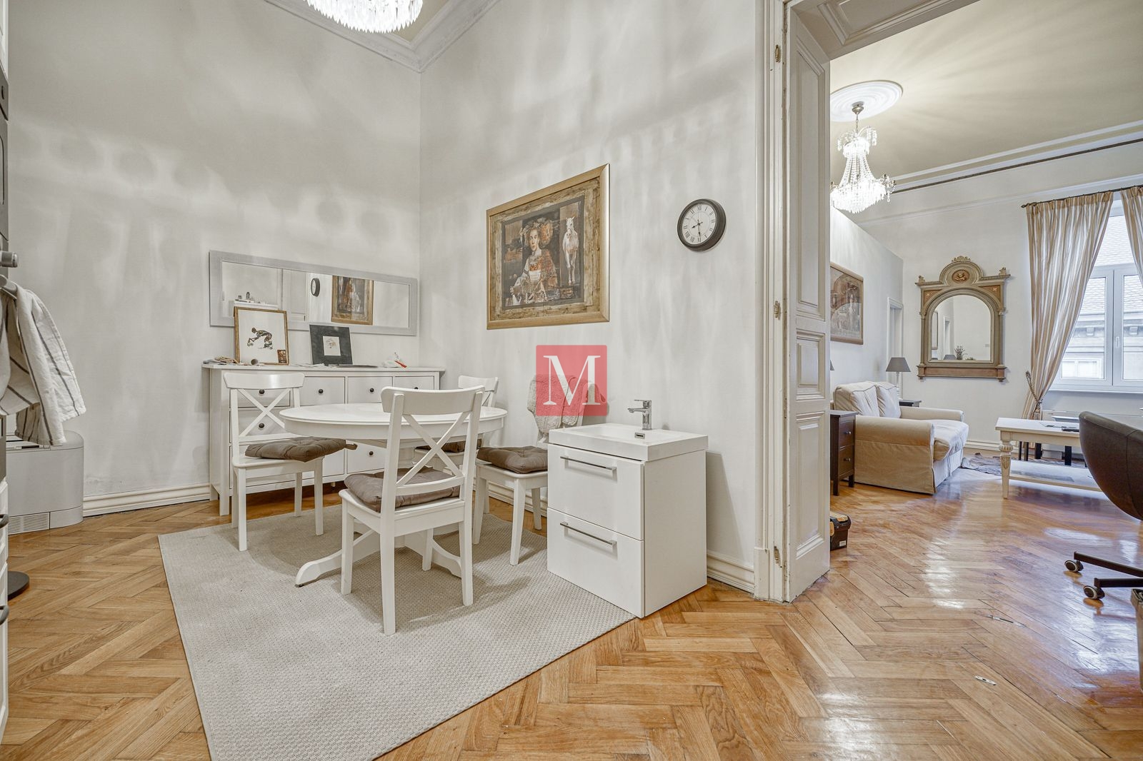 Veći stan se sastoji od reprezentativnog ulaznog hodnika, 2 salonske prostorije (sjever), 2 salonske prostorije i balkona od 4m2 (jug), manje sobe, kuhinje, 2 kupaonice (istok) i zatvorene loggie (zapad).