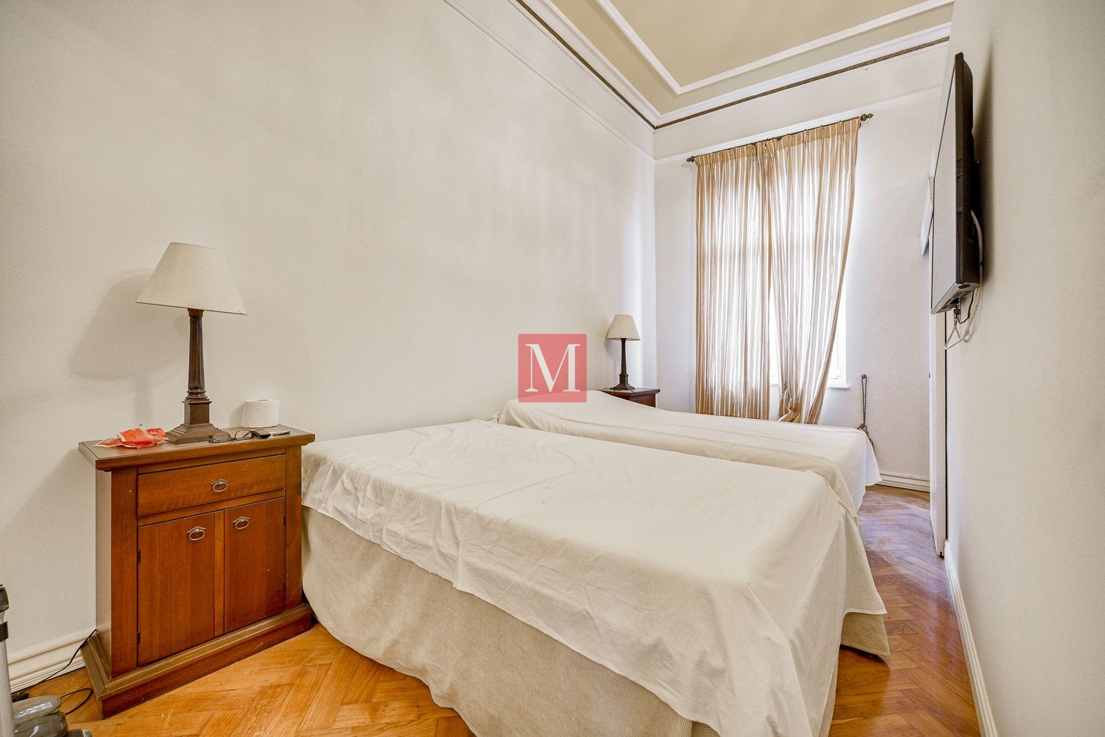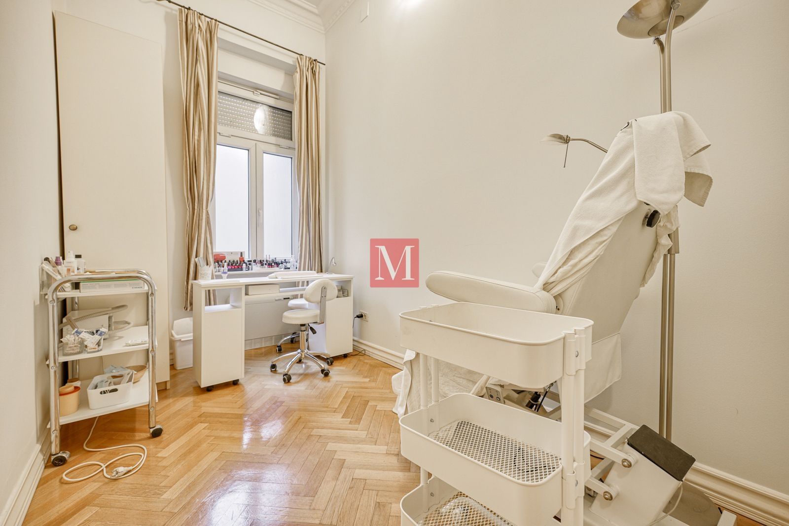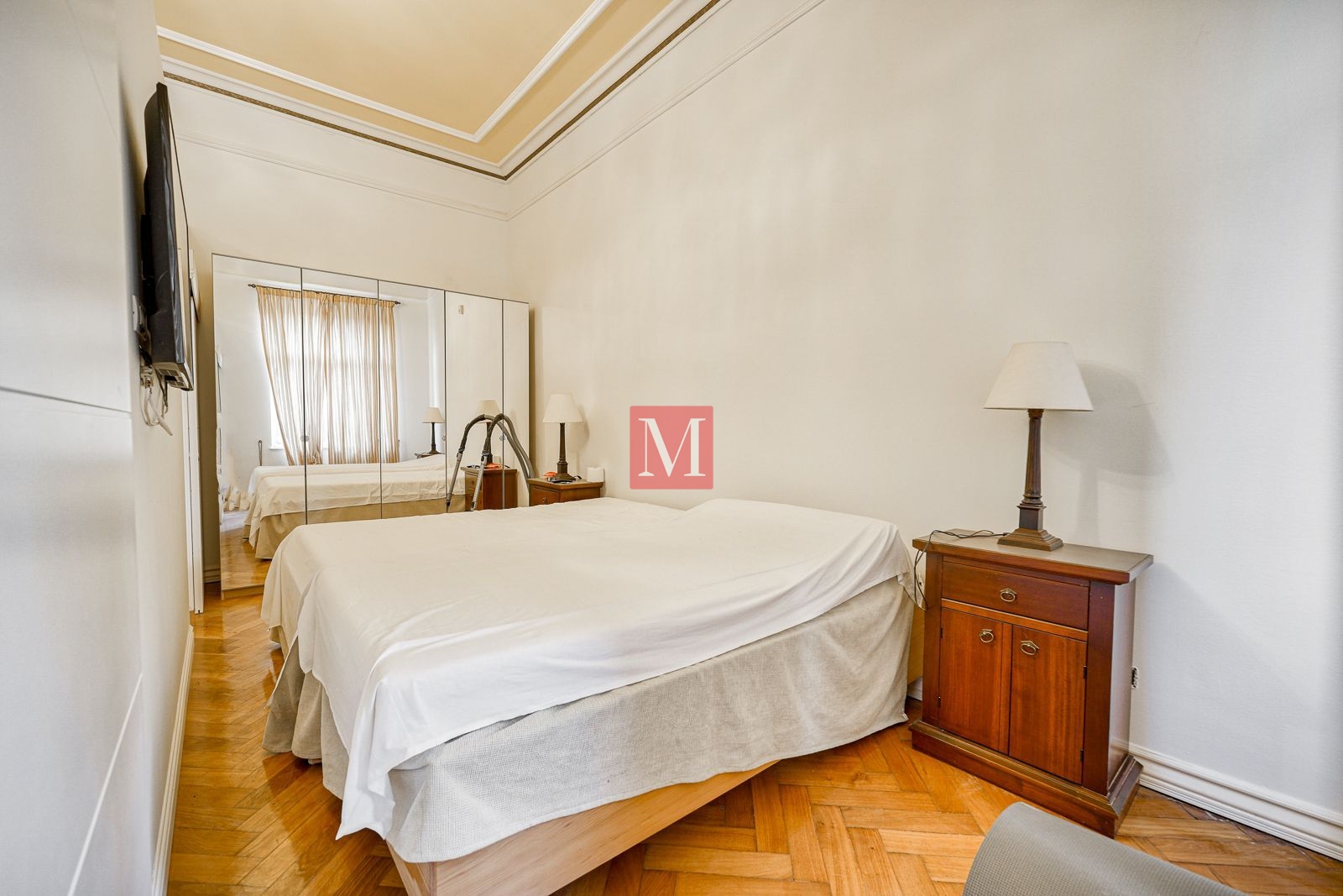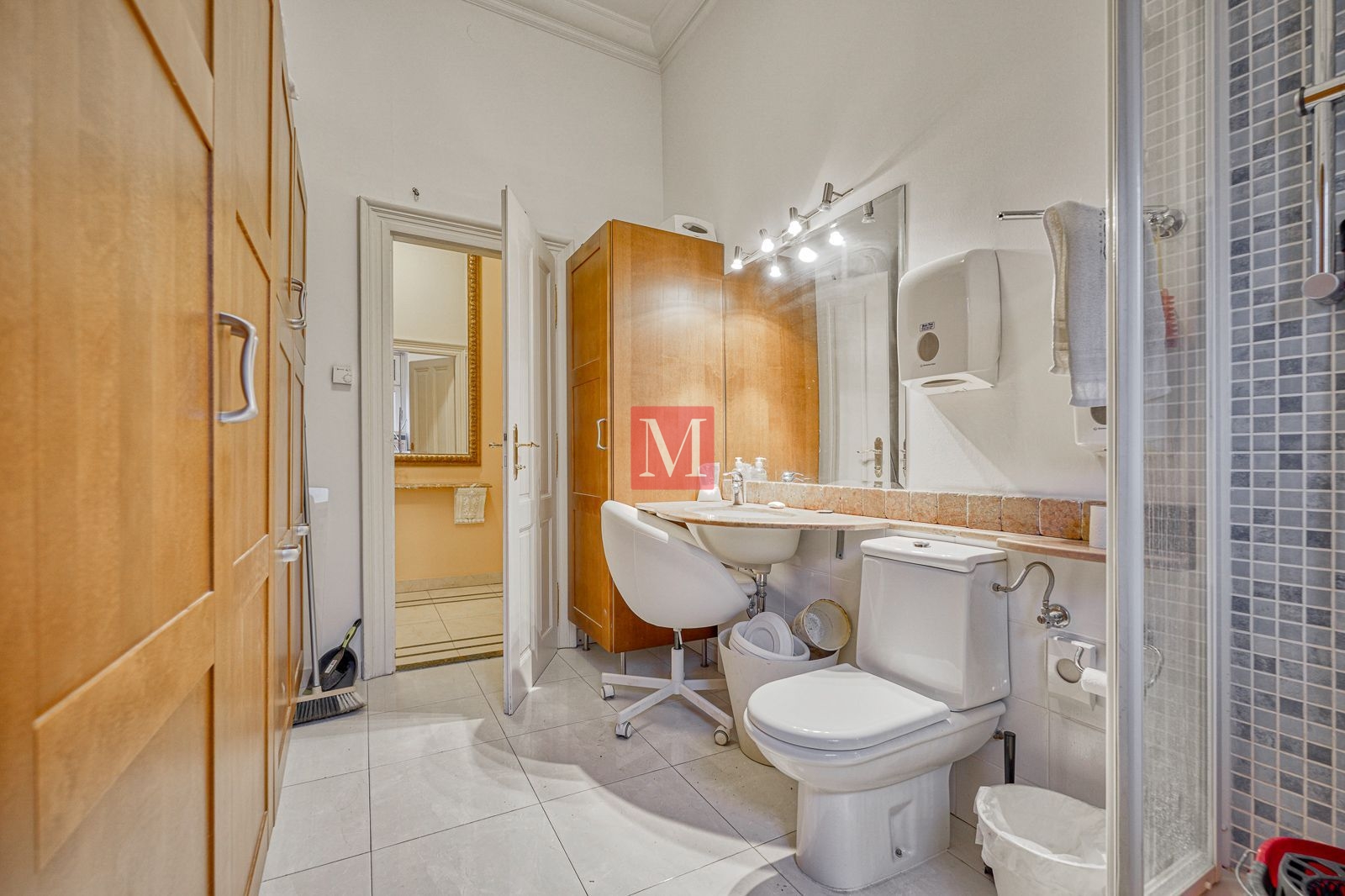 Veći stan se sastoji od reprezentativnog ulaznog hodnika, 2 salonske prostorije (sjever), 2 salonske prostorije i balkona od 4m2 (jug), manje sobe, kuhinje, 2 kupaonice (istok) i zatvorene loggie (zapad).