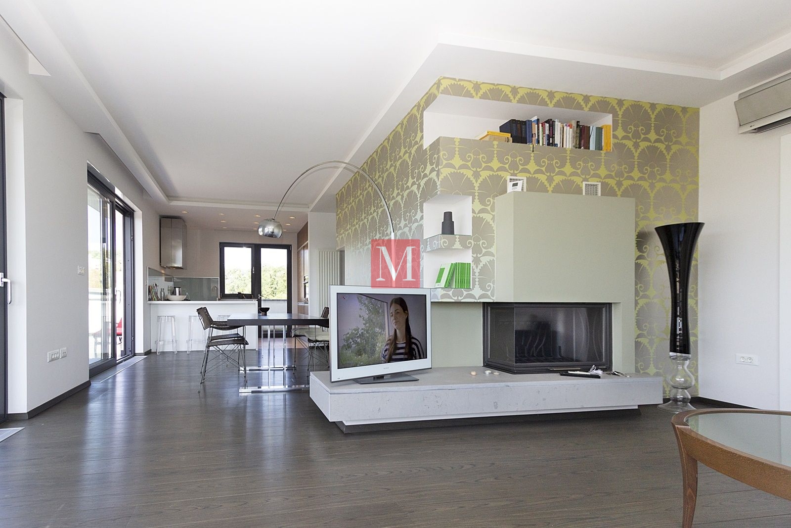 Sav namještaj i oprema su dizajnerski, u dnevnom boravku dodatan ugođaj stvara i prekrasan, veliki kamin, sve sobe su klimatizirane, podno grijanje u kupaonicama.