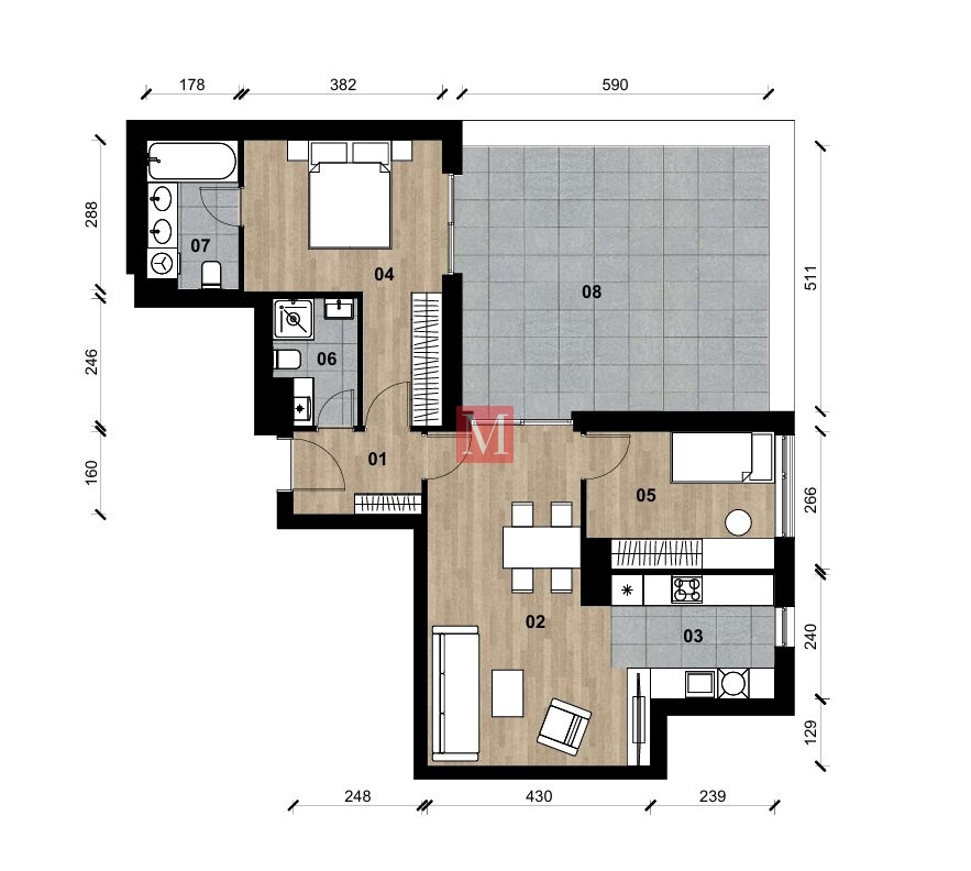 Sastoji se od ulaznog hola i hodnika, 2 spavaće sobe, 2 kupaonice, blagovaonice i dnevnog boravka, velike terase, te kuhinje koja gleda na istočnu stranu.