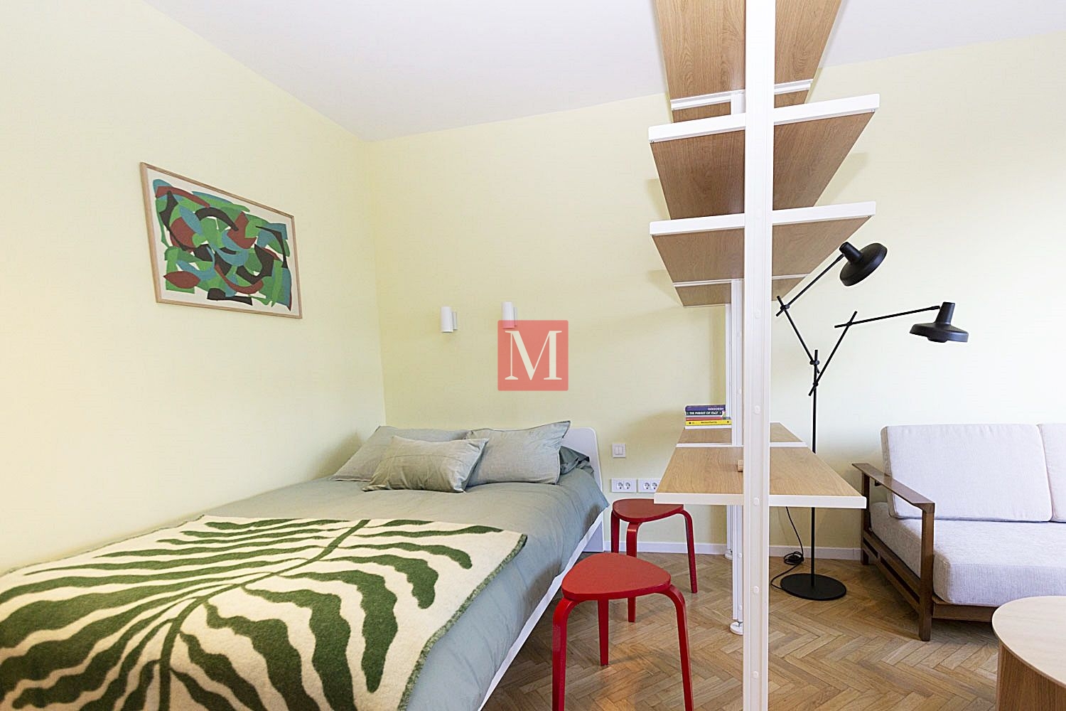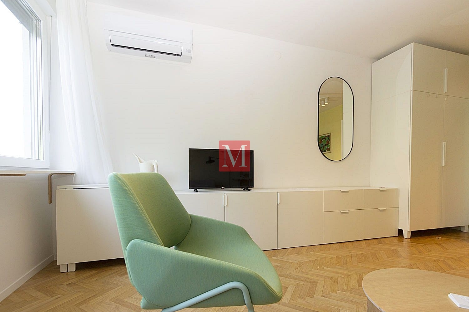 Sastoji se od hodnika, u kojem je smješten veliki ugradbeni ormar i mini kuhinja opremljena s 2 električna kuhala, sudoperom, hladnjakom, mikrovalnom pećnicom, velike sobe u kojoj se nalazi kauč na razvlačenje, stolić, fotelja, komoda s tv-om, police za knjige i veliki bračni krevet, te kupaonica s tušem, wc-om i perilicom rublja.