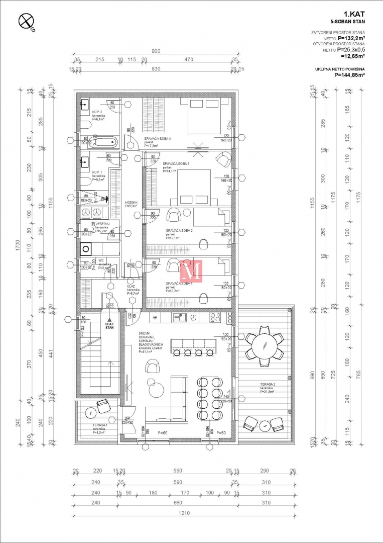 Zatvorena površina stana je 132,20 m2, a površina terasa je 25,30m2 (izravan pristup u privatni dio vrta sa veće terase). Prodajna površina stana sa terasama je 144,85m2.