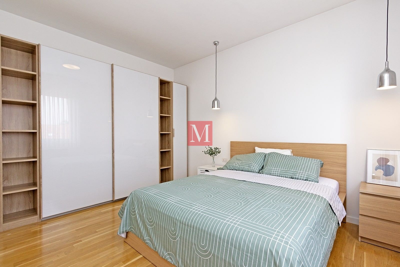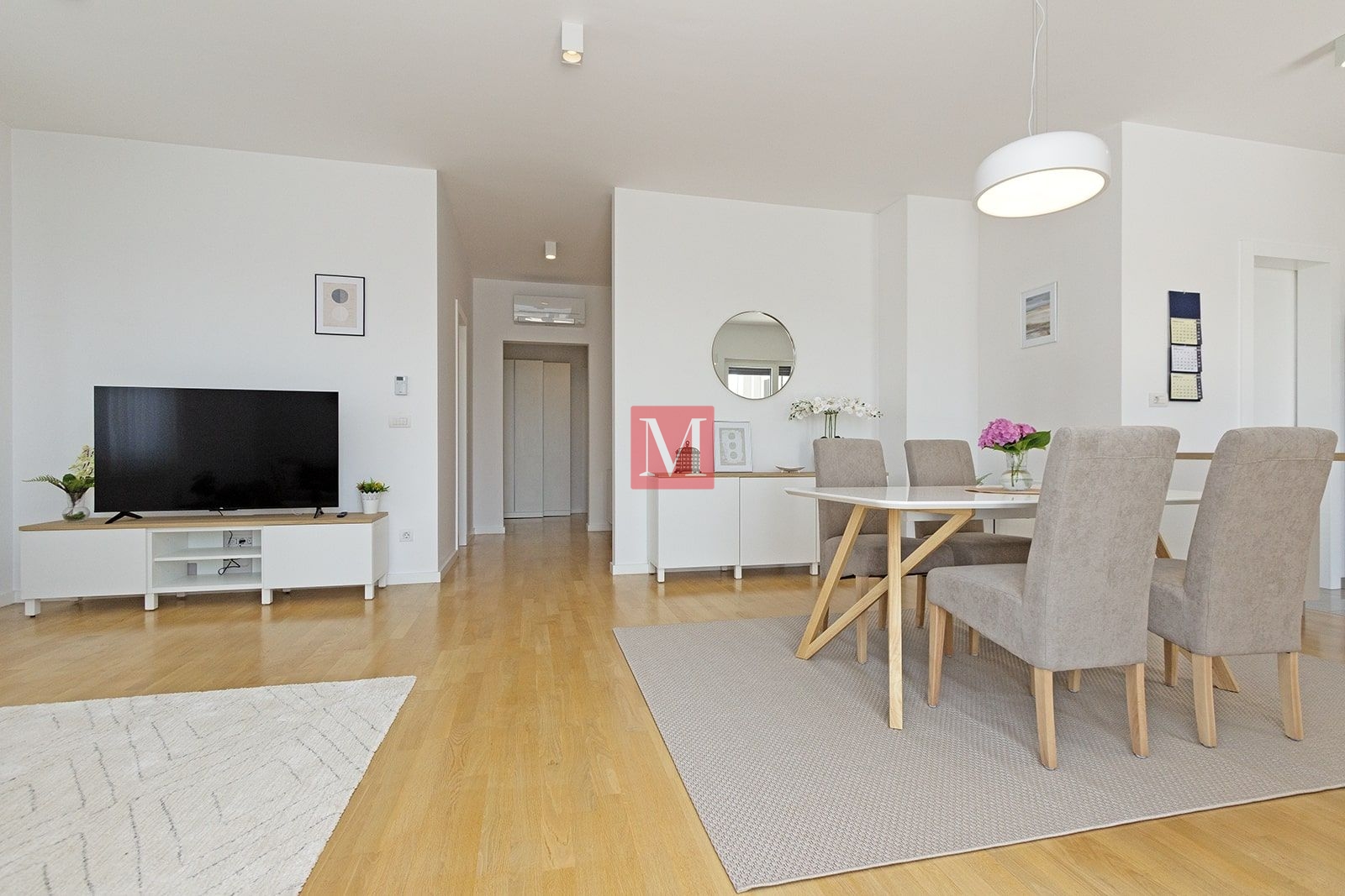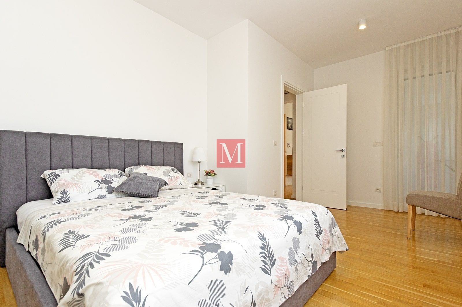 Stan ima novu luksuznu opremu (Villeroy & Boch sanitarije, Electrolux kuhinjski aparati, hrastov parket, el. podizači roleta, ugradbeni ormari rađeni po mjeri etc.) i iznajmljuje se kompletno namješten.