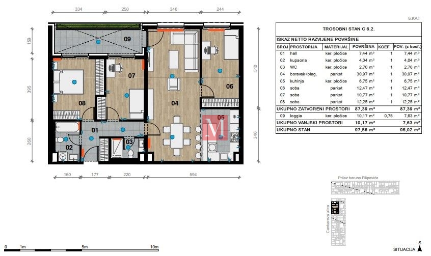 Raspoloživ četverosoban stan oznake C 6.2. na 6. katu zgrade, ukupne površine NKP 95.02 m2, na frekventnoj mikrolokaciji u neposrednoj blizini svih bitnih sadržaja, javnog prijevoza i centra grada.