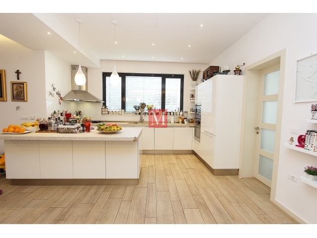 – prizemlje: sredisnji vrt – izravan pristup svim prostorijama: garaža s 2 parkirna mjesta, predsoblje, dvije garderobe (privatna i gostinjska), spremište, WC, 40m2 dnevnog boravka (kamin) + 20m2 boravka s aperitiv barom s izravnim pristupom na vrt, kuhinja, blagovaonica s izravnim pristupom vrtu.
