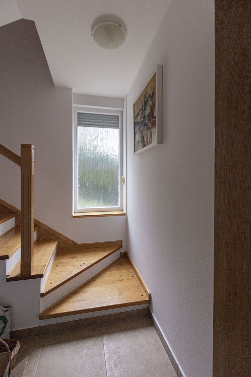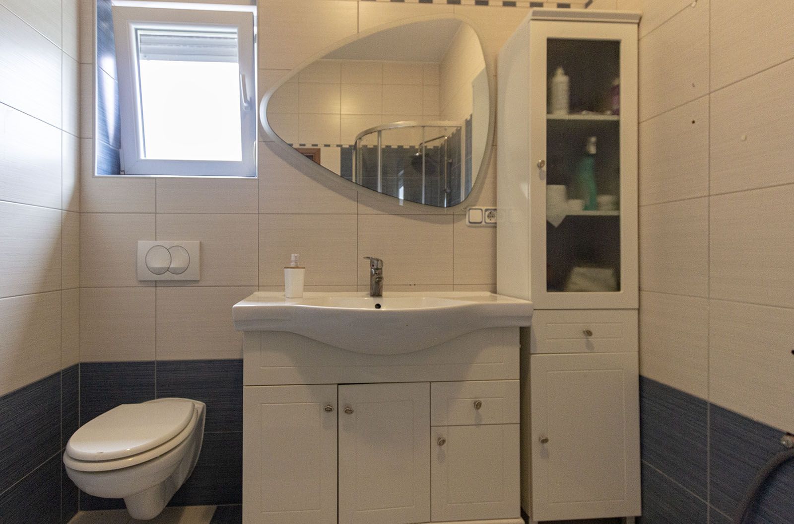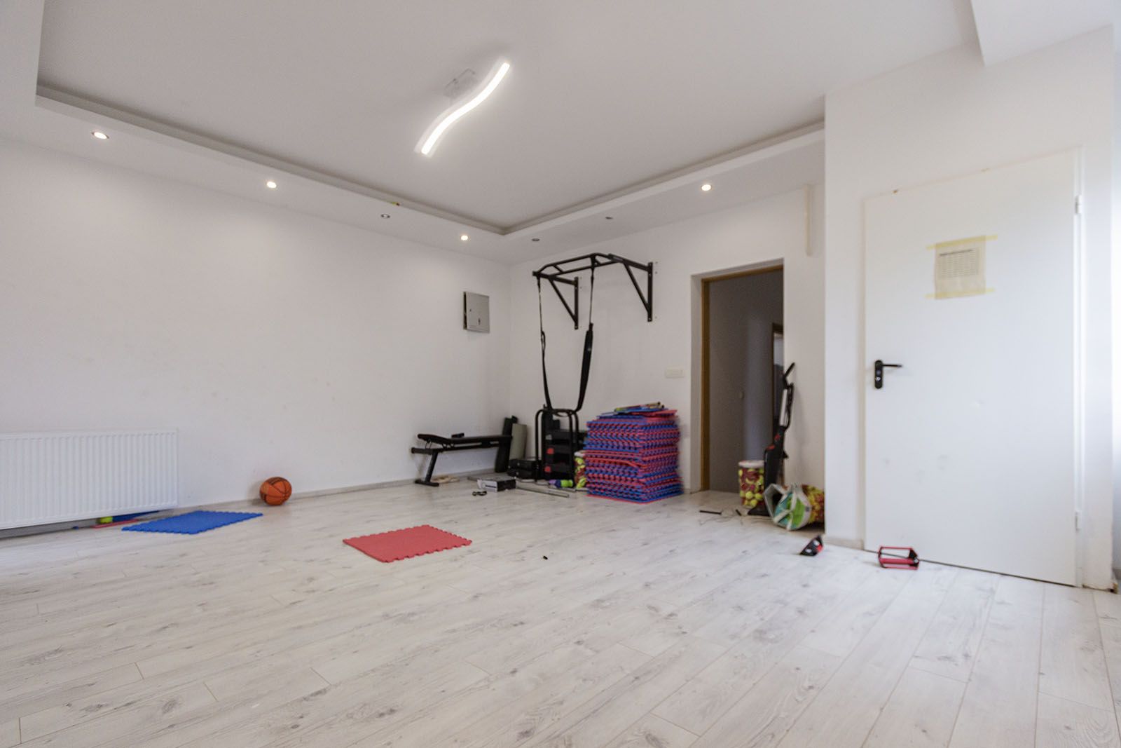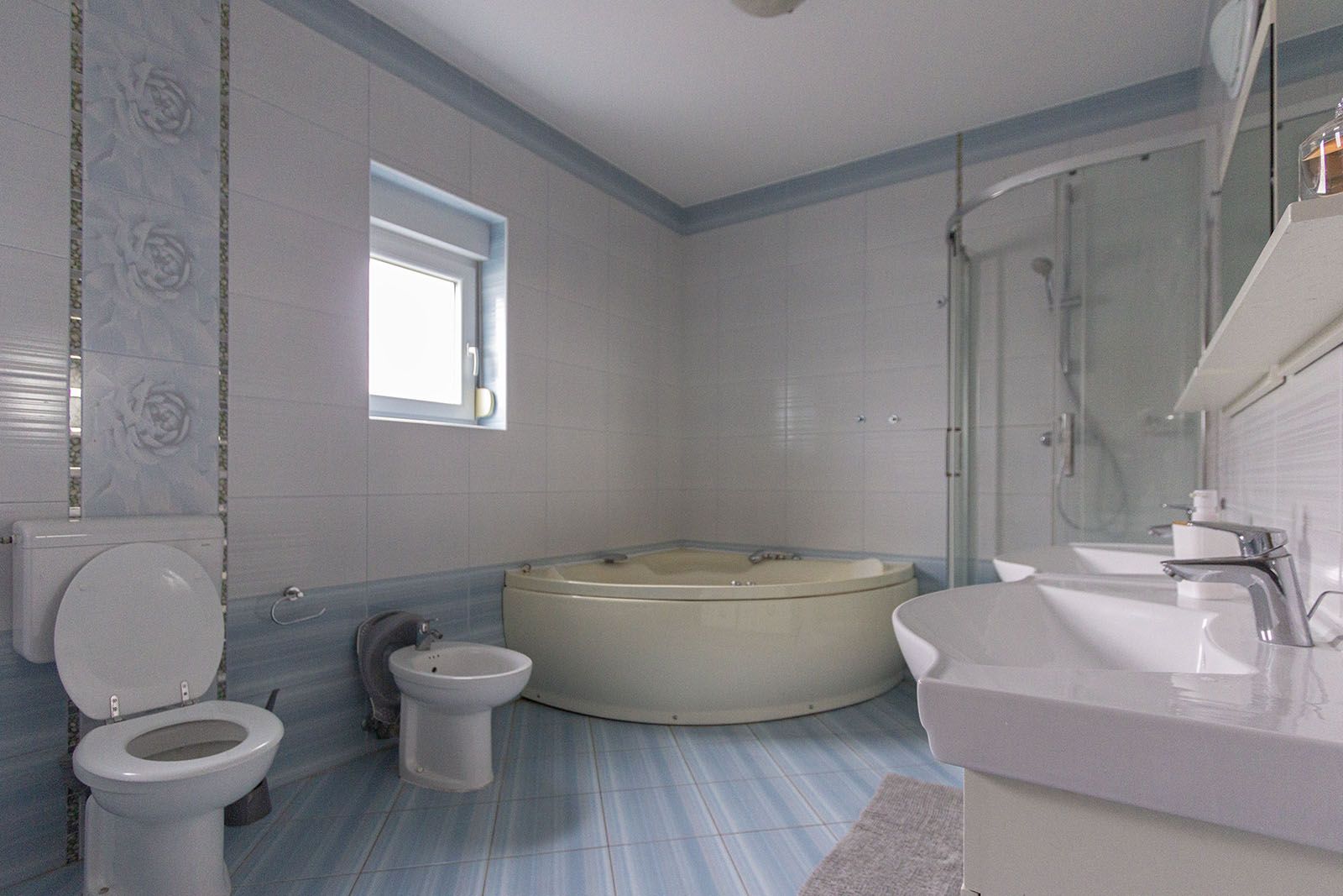Kuća se sastoji od ulaznog hola, unutarnjeg i vanjskog stubišta, 2 kuhinje, 5 spavaćih soba, jednog velikog open space dnevnpog boravka s balgovaonicom, 2 kupaonice, 2 toaleta od kojih jedan služi kao praona, teretane/fitness sobe, 2 terase, ostave i predivne okućnice koja je uređena i opremljena roštiljem.
