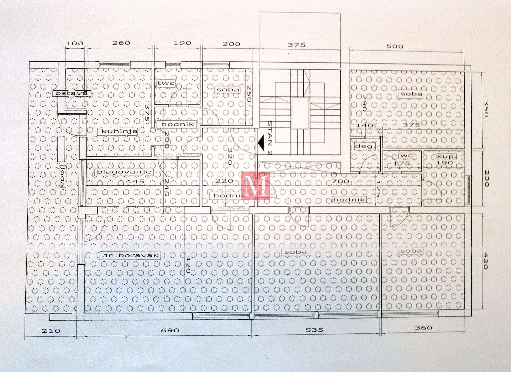 Neto površina stana je 143 m2, a obračunska s garažom, ostavom, parkingom i terasom je u totalu 178 m2.
