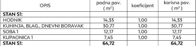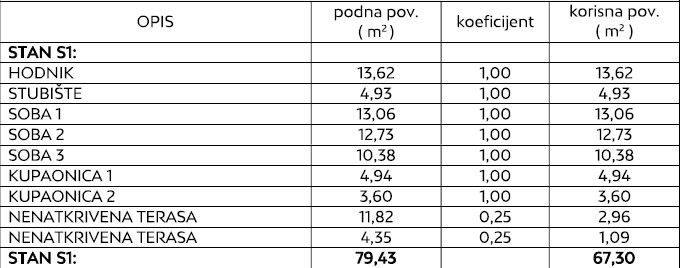 Na prvom katu se nalaze tri spavaće sobe (od kojih je jedna sa zasebnom kupaonicom), dvije kupaonice, hodnik i terasa (NKP 4,05m2), ukupne netto površine 67,30m2.